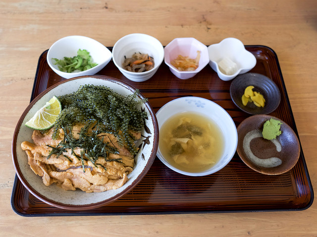 沖縄の 古宇利島 で、アクアブルーの海を眺めながら、ランチに ウニ丼 を食べました! 古宇利島の高台にある「 むらの茶屋 」 テーブル席からは、アクアブルーのきれいな海や、古宇利島大橋が一望できます! 都会では絶対に味わえない、極上の景色を楽しんで下さい! 古宇利島 特産のウニはシラヒゲウニといってモズクやアオサを主に食べて育つそうです。 やわらかな甘さが溶けるように広がり、虜になります。 ウニ丼には、汁はカツオだし、冷奴、もずく、ゴーヤのお浸し、たくあん、マカロニサラダ、イモ、煮凍り? (何が入っているのか観察し忘れたけど、美味しかったです)がセットされています。 気になるお値段は2,000円。 下調べで沖縄に住んでいながら古宇利島のウニ丼&タコ丼を食べたことがありませんでした~。 とっても美味しそうですね(^_^) 早速,食べに出掛けてきます~ ありがとうございました♪